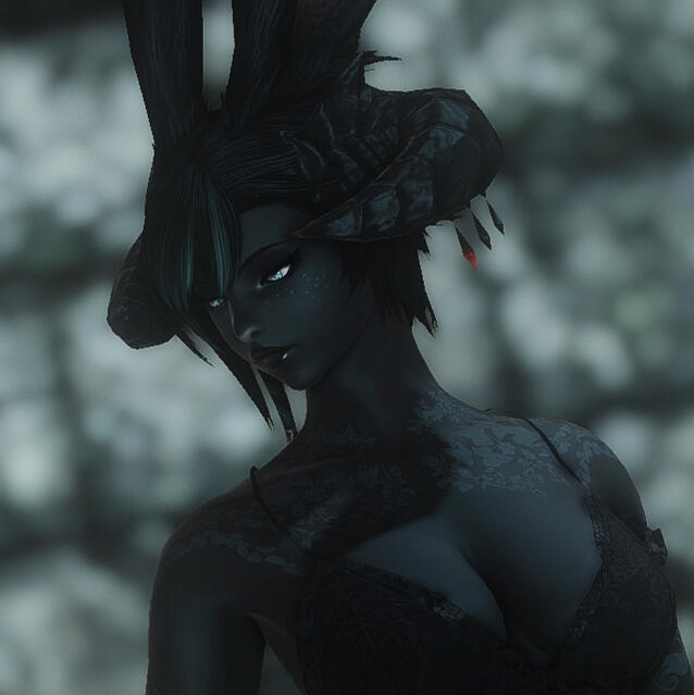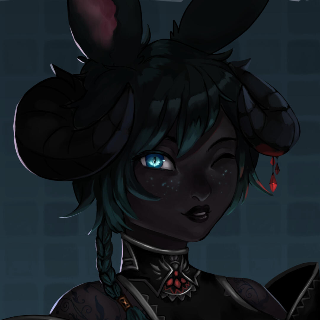 Her hair is black in coloration with faint turquoise highlights. Her eyes are an icy blue and contrast her dark complexion. Turquoise freckles softly dot her upper cheeks while being careful to avoid the bridge of her nose. Her lipstick, always black, slightly shines in the light as a result of the gloss constantly overtop of it. Tattoos can be seen across her body, most commonly a bluish-white hue. Horns jut from her head but they are entirely deaf, and as Zetta likes to put it, "only serve the purpose of making me feel like an outcast among outcasts."